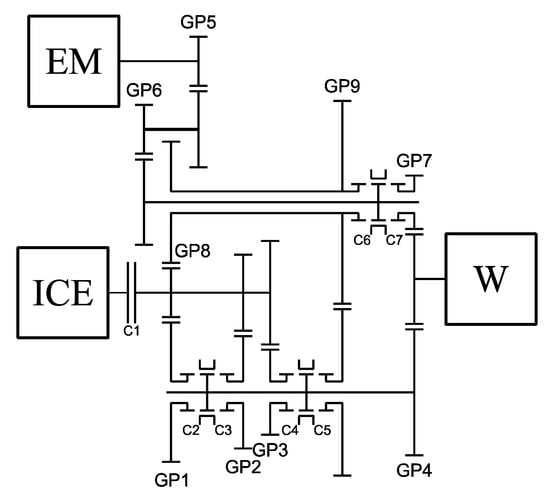 To clarify the challenges that are introduced by a novel parallel-hybrid-electric powertrain with a MIMO-transmission system, here such a system is presented. The presented system will also be used in the case study in Section 5 of this work, and is based on [8]. The system promises to combine the advantages of a P2 topology with those of a P3 topology, therefore in this paper we refer to this topology as “P2/P3”. The stick diagram of the considered system is shown in Figure 1.
