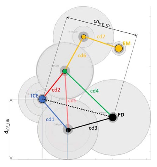 Here, an optimization-based approach is presented to find the gear diameters that minimize the deviation from a set of given objective transmission ratios while satisfying geometric boundaries. The core of the geometric evaluation are the center distances. The center distance between the ICE crankshaft and final drive (FD) is predefined. Additionally, a maximum distance between the ICE and the lowest part of the transmission is defined. With this last boundary a sufficient ground clearance can be assured. As displayed in Figure 2, the center distances are dependent on multiple gear pairs of which the gear diameters have to be optimized.