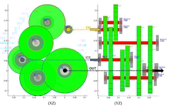 After an initial analysis, an additional intermediate stage for the EM in comparison to the patent application from [8] was introduced. Therefore, the distance and relative position between EM and ICE in the XZ-plane can be varied by pivoting the EM input in relation to the added intermediate shaft and pivoting the added intermediate shaft in relation to the shaft it meshes with via GP6. Therefore, no boundary is included to fix the center distance of the EM.