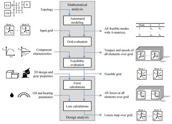 To enable the estimation of the power losses for novel MIMO-transmission systems as introduced before, we propose a method that consists of two main steps: The mathematical analysis step and the design analysis step. In the mathematical analysis, the torques and rotational speeds of all elements of the transmission are determined in a systematic way. In the second step, these torques and speeds are used to estimate all individual power losses, which are summed up to obtain the total power losses in a map over a defined input grid. An overview of the proposed method is shown in Figure 4, below all sub-steps are explained in detail.