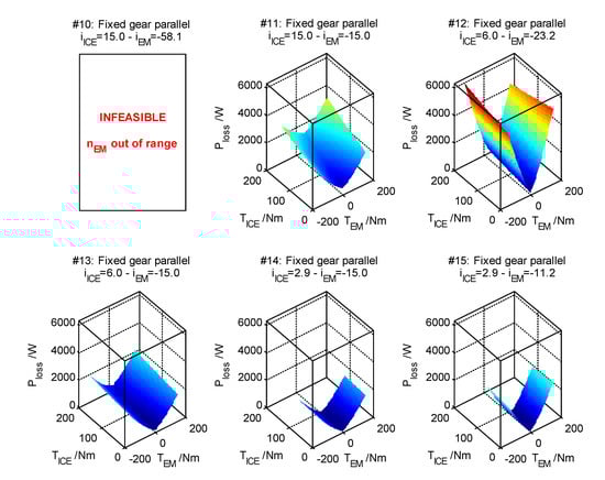 The P2/P3 topology enables 18 distinct transmission modes, as listed in Table 1. In this case study, all modes with the ICE and EM in forward gear can be selected by the control strategy, but to incorporate the transmission system power losses only the characteristic power loss maps of the six hybrid modes with the ICE and EM in forward gear (modes #10 to #15) are used. For electric driving with the EM connected in P2 setting (modes #5, #7, and #9), the transmission losses are identical to the losses in the corresponding hybrid modes (#10, #12, and #15, respectively) with . For electric driving with the EM connected in P3 setting (mode #8), the losses cannot be represented exactly by the loss characteristics of mode #11, #13, or #14. This deviation arises from increased speed dependent losses. However, using mode #14 with , the resulting transmission losses are nearly identical to the losses of mode #8. In modes #11 and #13 with , the transmission losses are noticeably higher due to the higher revolution speeds of ICE input shaft and ICE gearwheels. Therefore, the power loss map of mode #14 is used to model the transmission losses of mode #8 instead of implementing an additional power loss map.