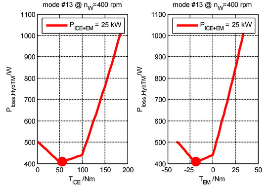 One challenge for the consideration of transmission systems power losses in the control optimization is that the provided power of both power sources induces transmission losses, whereas the contribution of each power source to the total transmission losses cannot be directly determined in the considered MIMO-transmission systems. Another challenge is the dependency of the transmission losses on the selected mode and torque split. This means that distinct control inputs lead to distinct transmission losses albeit equal summed input power from ICE and EM. This is a challenge because to find a legit local minimum of the quality-functional (17) of the control strategy, the evaluated sets of control variable candidates must provide equal output power at the wheels.