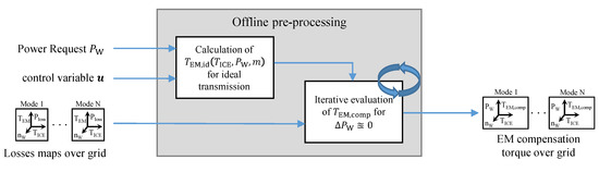 The first step of the compensation method is an offline pre-processing. A compensation torque map of the minimum required compensation torque to be provided by the EM, , is calculated offline in advance. Starting with the required EM torque for an ideal transmission system with no power losses, for each combination of mode and wheel speed , the compensation torque is determined iteratively as a function of each valid value of of the control variable and the required total output power . This process is visualized in Figure 7.