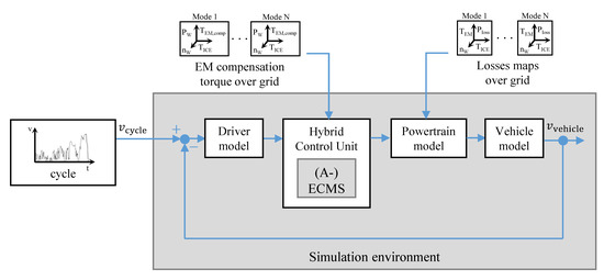 To enable the consideration of transmission systems power losses in the simulative assessment, the additionally generated information is fed into the simulation environment in two different sub models. First, the power loss characteristics must be considered in the powertrain model. In addition, the operating strategy as part of the hybrid control unit (HCU) needs to have information about the required additional power loss compensation torque for the correct selection of a candidate set of the control variable to minimize the quality functional (17) in each time step. The extended simulation environment is schematically visualized in Figure 8.