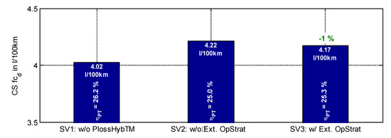 Due to the disregard of transmission systems power losses, the CS fuel consumption in the WLTC is the lowest for SV1. The estimated CS consumption increases by () for variant SV2, which considers the transmission losses in the powertrain model but is blind for these losses on the control system. Although the same loss model of the transmission system is implemented in the powertrain model, the CS fuel consumption can be reduced by 1% () through the extended operating strategy of SV3—only by improved control.