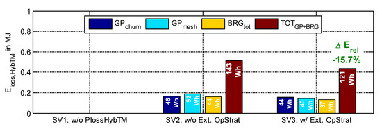 Figure 10 shows the total transmission losses occurring in cycle operation in WLTC, as well as the distribution of the losses to the respective loss types of the transmission power loss model. This illustrates that a major contribution to the reduction in CS consumption of the extended operating strategy results from a reduction of the overall transmission losses (). The extended operating strategy achieves the greatest advantage in the area of gear meshing losses, representing approximately of the overall reduction of transmission losses.