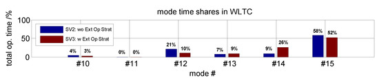 The significant reduction of meshing losses can be explained by the comparison of the time shares of transmission modes, as displayed in Figure 11. This figure shows the time shares over the WLTC for SV2 and SV3. The extended operating strategy reduces the use of modes #12 and #15, both with P2 setting of the EM. Instead, the use of modes #13 and #14, with the EM connected via the P3 setting, is increased. The extended operating strategy is able to evaluate the advantage of the additional EM ratios in the P2 modes resulting from the connection of the EM to the sub-transmission of the ICE compared to the additional transmission losses in these transmission modes. Due to the knowledge of the transmission losses, this decision is often in favor of the direct connection in P3 modes.