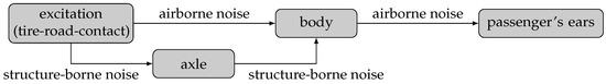 Transfer chain for interior road noise from the excitation to the passenger’s ears, parts from [9] (p. 170).