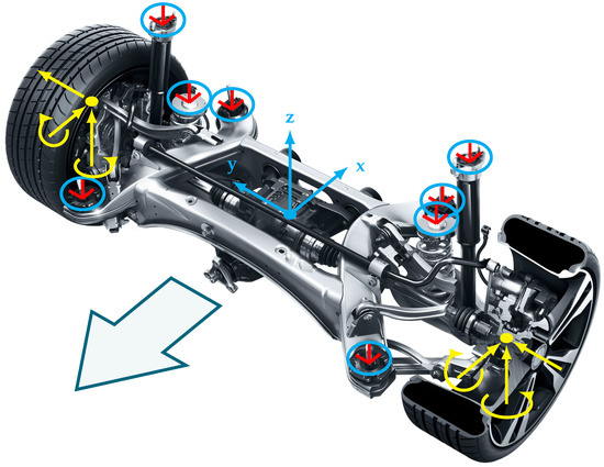 The axle’s transfer path is not only determined by elasticity and damping, but also by mass, inertia, and the geometrical layout [17,18]. As the potentials of tweaking the elasticity and the damping of the bushings are well known, the kinematics of the suspension has an unknown effect on the transfer function [10] (p. 77).