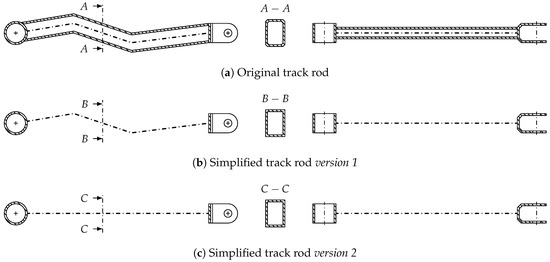 The track rod is a simple part of the suspension. It is a long, thin rod that connects two hinges mainly by tension or compression [5] (p. 550). The original part in Figure 3a is completely modeled using FE shell elements for the rod part, the bushing ring, and the bushing clamp. On the left, we display the back view—on the right, the top view. In the middle, the cross section is displayed. The track rod is hollow because it is made from a bent sheet metal. The FE model was created by meshing a Computer Aided Design (CAD) part in a preprocessor.
