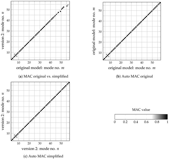 Figure 4 shows the MAC plots for the complete axle using the original track rod and the simplified track rod version 2. Figure 4a shows the comparison, Figure 4b,c the auto MAC values for the original and version 2 model, respectively. For the auto MAC value, the same model is used twice in Equation (4). It is commonly used to identify similar looking modes. In the MAC plots, mode numbers start from 3 since modes 1 and 2 are the rigid body modes of the two break disks rotating around the wheel hub at 0 Hz.