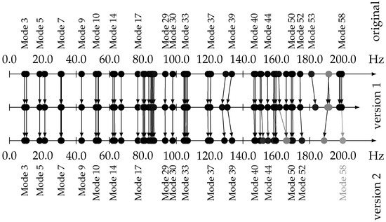 The MAC plots from Figure 4 don’t give any information regarding frequency shifts. We can only identify mode shifts if the frequencies of single modes are shifted so that the order of the modes changes. Therefore, we plot all the high MAC values next to the diagonal line in Figure 4a into a new Figure 5. We see the modes of the original model on the top line, the ones of version 1 on the middle line and version 2 on the baseline. Arrows indicate where mode frequencies lie for each model version using the MAC value colors from Figure 4. Straight arrows from top to bottom indicate no change in mode frequencies.