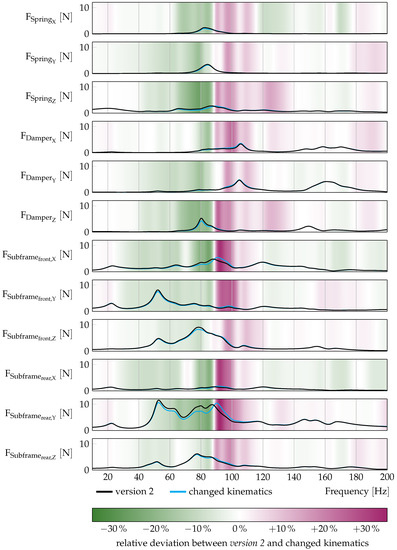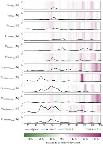 Figure 6 shows FRF for all three models for the left attachment points. We see all three directions for the attachment points spring, damper, subframe front, and subframe rear. The color code in the background indicates relative differences between the original model and the simplified models. It indicates the maximum relative deviation from the original model, to either simplified model version 1 or 2. The scale of the color indicator from −30% to +30% will be relevant and discussed in Section 3. All three FRF lines are almost indistinguishable, which leads us to the conclusion that the simplification of the modeling as well as the geometry itself is possible without affecting the FRF function in a relevant way. The darker colors to the right indicate some larger relative deviations where the FRF values themselves are below 1. This results in bigger relative errors for minimal deviations. For frequencies above 200 , changes are even smaller.