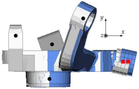 Using the method described in Section 2, it is possible to automatically create FE simulation models for changed suspension kinematics. To demonstrate the possibilities of the method, we move the connection point between the knuckle and the track rod. The red squares in Figure 7 between the knuckle and the track rod indicate the backward shift in a positive x-direction by 10 mm. The original model in white is changed into the model in blue. The automatic morphing only shifts the connection point marked in red while all the black points stay unchanged. This increases the lever arm between the wheel hub and the track rod. Additionally, we automatically generate simplified straight beam track rods and assemble a new axle model. In this investigation, we always use the simplified straight track rod version 2 from Figure 3c, hence from now on simply naming it track rod.