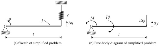 Changing the connection point between the knuckle and the track rod by moving it in a positive x-direction can be investigated by the simplified undamped model given in Figure 9a. We see the axle from the top with the wheel hub as the fixed mount with a rotational degree of freedom. This represents the steering rotation. The track rod and its connection to the knuckle and the subframe is modeled by a spring with stiffness c. The knuckle with inertia J rotates around the wheel hub in the coordinate . The length between the wheel hub and the connection point between the knuckle and the track rod is named l. If the knuckle rotates, the spring is compressed by but does not introduce any torque.