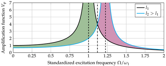 Both amplification functions are given in Figure 10. We assumed that c and J were worth 1 in order to get simple plots. We can see the two poles at and indicated by two black dashed lines. They are calculated by Equation (8) and they are the zero of the denominator in Equation (11). Shifting the amplification function by enlarging l leads to decreased amplitudes, indicated in green, left of the intersection point between both amplification functions. To the right of it, amplitudes are increased, indicated in red. Calculating this intersection point by solving
