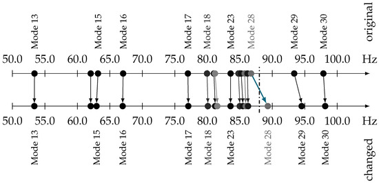 In Figure 11, we see modes from 50 Hz to 100 in the same MAC color code used in Figure 4. On the top line are the modes before changing the kinematics—on the bottom the modes after changing the kinematics. Straight arrows from top to bottom indicate no change in the mode’s frequencies. Diagonal arrows indicate a mode shift. We clearly see mode 28 being shifted from up to . Using Equation (13), we get a splitting frequency of . Additionally, we find the maxima of all changes in Figure 8, indicated by maximum green and red color exactly at both the old and new eigenfrequencies, respectively.
