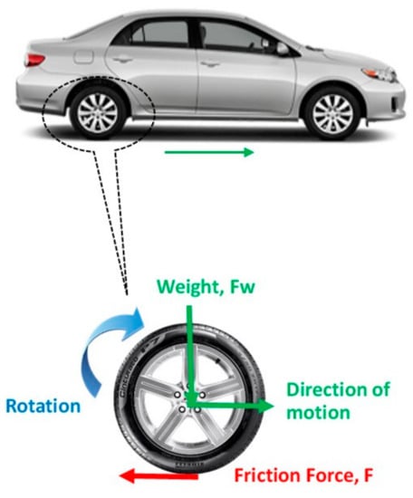 Focusing on the vehicles’ braking as a result of a vehicle-infrastructure interaction, friction between the tyre tread and pavement surface is the resistive force developed when a vehicle starts braking, prevented from rotating and instead skids along the pavement surface [,]. The frictional force between tyres and pavement is generally characterized by a dimensionless coefficient known as coefficient of friction (CoF), which is the ratio of the tangential force at the contact interface to the longitudinal force on the wheel as shown in Figure 1 and it is given by Equation (1) [].