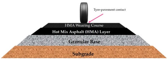 When a tyre is free rolling along a straight distance, the tyre-contact patch is instantaneously stationary and there is almost no friction at the tyre-road interface []. However, when a driver starts maneuvering including changing speed or direction, friction is developed at the interface as a response to acceleration, braking, or steering and a reaction is caused between the tyre and the pavement wearing courses according to a typical asphalt pavement cross-section illustrated in Figure 2. The wearing course comes in direct contact with the tyres; thus, it should be characterized by increased friction levels. the afore-mentioned reaction enables the vehicle to speed up and slow down, or even move around curvatures [].
