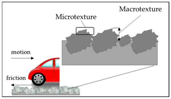 From an infrastructure perspective, pavement surface texture is known to directly influence tyre–pavement friction. The two basic components that are critical to the friction development are: macrotexture and microtexture, which are both interrelated to the properties of the materials used for pavement surface construction [,]. For instance, for a pavement surface made of asphalt mixture, the aggregate gradation in the asphalt—mixture, air void content and binder properties mainly influence the pavement macrotexture, while aggregate mineralogy and their shape mainly affect microtexture levels [,]. In Figure 3, both macrotexture and microtexture components are graphically pictured to explain their contribution in tyre–pavement friction.