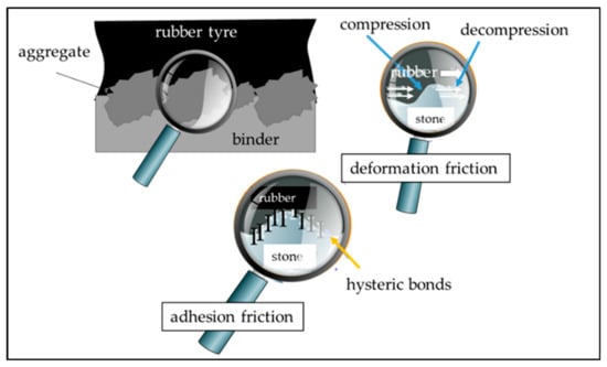 In particular, macrotexture and microtexture contribute to the development of tyre–pavement surface friction through the mechanisms of hysteresis and adhesion [,] respectively (Figure 4). Particularly, hysteresis is developed due to the continuous loading and unloading of the tyre-tread while it is in contact with the surface aggregates of the pavements. These continuous changes of its contact shape cause loss of energy in form of heat [,]. Consequently, hysteresis is affected by the overall profile of the aggregates, indicating that macrotexture influences this component. Adhesion results from the development of small-scale molecular bonds between the tyre-tread and the pavement surface [,]. It represents the shear force that is generated when the tyre reforms its shape to conform to the asperities of the surface aggregates []. As such, aggregates microtexture mainly influences adhesion [].