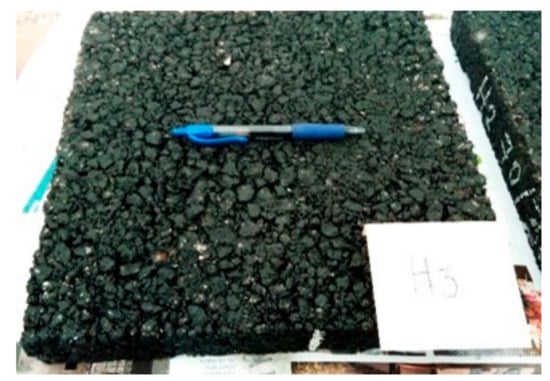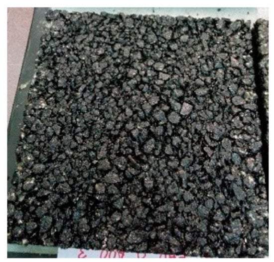 Loose asphalt-mixture of category HB was collected before being used for layering a wearing course/antiskid surface of a real road. HB is a hot-mix asphalt (HMA) concrete, with an open-graded mixture given the O-5 mix designation according to the []. Steel slag was used into the mix design as aggregate type and a polymer-modified bitumen of 25–55/70 grade penetration was added. The HB mixture contained 5% asphalt bitumen binder by mass of the mixture (Figure 6).