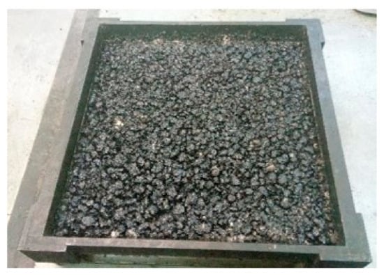 The mixture was heated in an oven and a low amount of asphalt bitumen was added (1–2% approximately). Both original HMA and RAP were mixed properly to produce a homogeneous mixture. Then, it was put in the same molds (305 mm × 305 mm × 40 mm) and compacted in the steel rolling compactor (Figure 10).