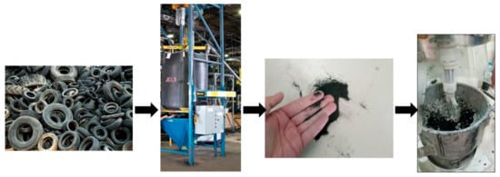 The sustainable RAR modifier is comprised of three materials, a fine crumb rubber, inert fillers and bitumen. The material in its physical state is a black fine viscous material with a bulk density of 0.6 g/cm3 and a flash point of greater than 300 °C. The individual rubber modifier particles are less than 600 microns in size and the majority of them was of between 250–600 microns in size. Figure 7 shows schematically how the RAR material can be utilized in roadway engineering initiated from its origin up to its final usage as an additive.