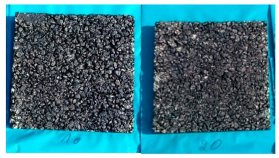 Prepared slabs using RAR additive with contents: 10% (left) and 20% (right) (slabs code: HC).