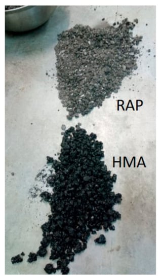 At this type of asphalt mixture, a certain percentage of RAP was used in the mixture combined with asphalt mixture used in category HB. More specifically, 70% of the asphalt mixture came from in-situ collection before layering (as in category HB) and the remaining 30% included RAP (Figure 9). Actually, the RAP material had exactly the same properties of the mixture in category HB but it aged more than five years until the time of road rehabilitation activities when it was moved out and collected for research purposes.