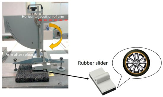 So far, there is a range of devices and systems appropriate to simulate vehicles’ tyre–pavement interaction. However, there are some discrepancies in their operation and principles. Hence, the calculated CoFs from different devices and systems are not always comparable []. In this study, tyre tread is simulated with the rubber tread used in the well-known system British Pendulum Tester (BPT) (Figure 12).