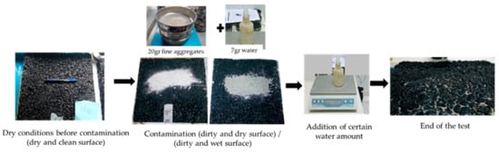 As described earlier, generally friction levels exhibit differences during wet and dry seasons mainly due to seasonal changes. Dry seasons are mainly characterized by loose debris on the surface that reduces the tyre-road contact. Wet seasons are characterized by more raining incidents that clean the surface and provide a rougher interface for the tyre treads of the moving vehicles. Noticeably, although the raining effect is proved to be mainly (but not always) positive after the end of rainfall (stop), the situation is rather different during the rainfall. Herein, dry and wet seasons were appropriately simulated in the laboratory environment according to a wetting protocol that has been followed in previous research studies [] for almost stable temperature at about 20 °C. A schematic illustration of the simulation process is shown in Figure 13. The basic principle was to simulate: