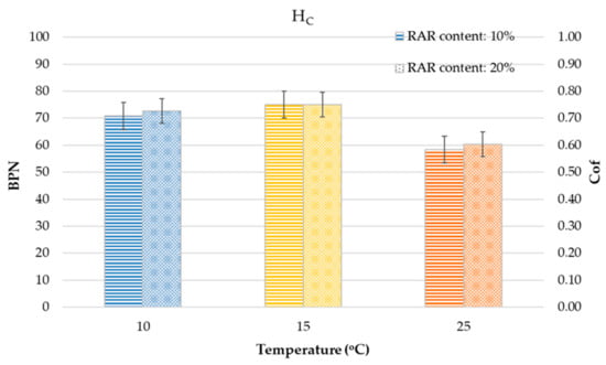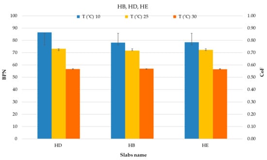 In the following figures apart from BPN, the respective CoF is presented, calculated as BPN/100. Figure 14 presents the effect of temperature changes in the types of asphalt mixtures represented from the categories HB, HD and HE where the testing temperatures were identical (as per Table 1).