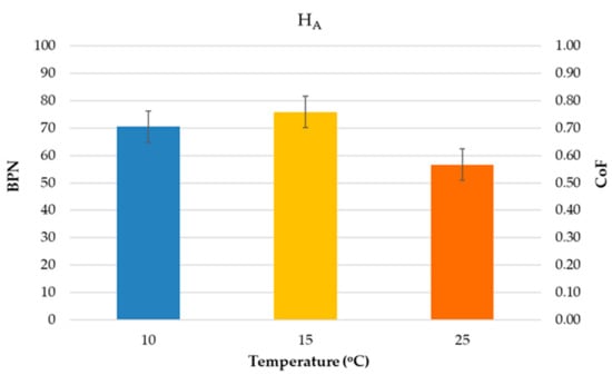 Figure 15 and Figure 16 present the influence of temperature change (as per Table 1) in the tyre–pavement friction in terms of BPN for the surfaces of HA and HC categories respectively.