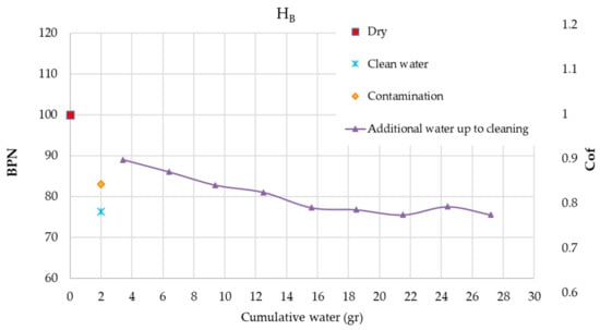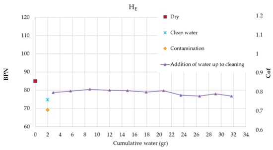 The following figures present the BPN and CoF values for each stage of contamination and rainfall (water addition) simulation based on the process that was previously described. First categories HB, HD and HE are presented in Figure 17, Figure 18 and Figure 19 correspondingly.