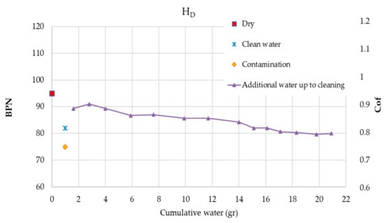 Particularly, in categories HB, HD and HE the testing started from the stage (2) when small amounts of water therein, started forming enormous capillary pressure. By adding small amount of water, the capillary pressure increased causing strong attraction between asperities of the fine aggregates so that the friction increased under the constant load of the BPT slider, compared to the BPN for clean water on clean surface. Additions of water in stage (3) led to a proportional break of capillary effect, while the wet contamination effect was bypassed by the movement of the BPT slider. This led to a decrease in friction level up to the final stage (4) when it became almost equal to the clean-wet condition. At stage (4), the surface of the aggregates was clean similar to the wet case without contamination and only some trapped contamination remained (in accordance with []), which did not influence the friction levels measured with BPT (Figure 21).