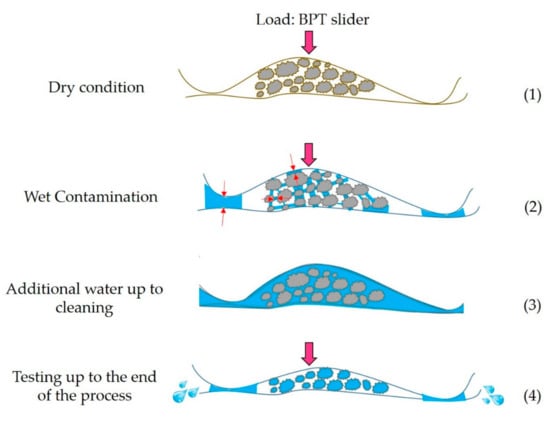 Regarding the rainfall simulation, an interesting part is the explanation of the high BPN at the beginning of water addition at the contaminated slabs for all categories. As the amount of water on the surface gradually increased, friction decreased up to the level of the clean wet surface. This trend can be explained through Figure 20, in which all stages from the dry contamination to the condition at the end of the testing are schematically presented. In Figure 20, the performance of the contamination before adding water and after that is explained under the load of the BPT slider [].