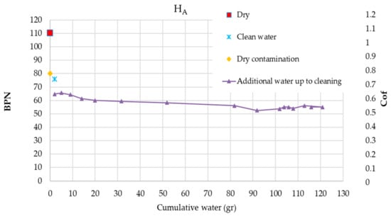 For categories HA and HC (only for 20% RAR content), the contamination was left until becoming dry (for a couple of days). Then BPN was measured on the dry contamination condition. Afterwards, water was rinsed with an increasing rate simulating a long rainfall effect.