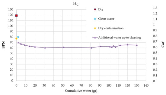 When water was rinsed on dry contamination, friction level dropped and afterwards no important variation was observed when adding extra water. At categories HA and HC, dry contamination and water formed a kind of lubricant that affected negatively tyre–pavement friction. In other words, it can be considered that rainfall on a dry but contaminated road surface may be very dangerous for the moving vehicles [,,]. Another, fact that has to be pinpointed is that the formed lubricant could not be removed effectively and the friction level did not reach the level of the clean water effect as happened in categories HB, HD and HE, although much more water was added for categories HA and HC. The effect of air voids in the contaminated phase was not proved to be consistent. At the beginning of water addition, HA friction levels seemed to increase by adding some amount of water in contrary to the HC where proportional decreasing trend was followed.