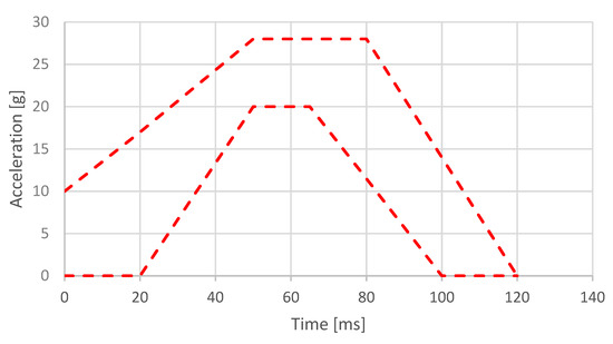 Description of the acceleration curve of the test trolley. For frontal impact, the trolley was propelled so that at the beginning of the test, its velocity was 50 (+ 0/− 2) km/h and its acceleration curve was within the hatched area.