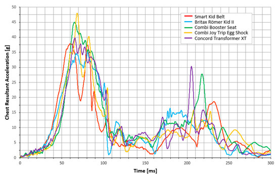 Chest Resultant Acceleration for all CRS tested as a function of time. The graph shows how the chest acceleration changes with time—the first, highest peaks provide information about the maximum chest acceleration during the rapid deceleration of the test bench.