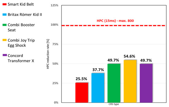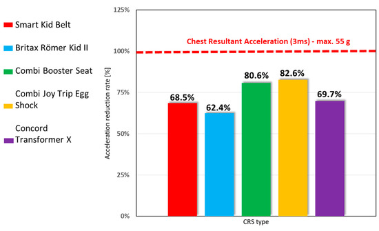 The comparison of the limit of acceleration pointed in Regulation No. 129 was made with the actual results obtained from the test. The final results are shown in the bar chart (Figure 3)—they are a ratio between test results and the Chest Resultant Acceleration specified in the Regulation (55 g), which determines the safety parameters of the particular Child Restraint System as a percentage.