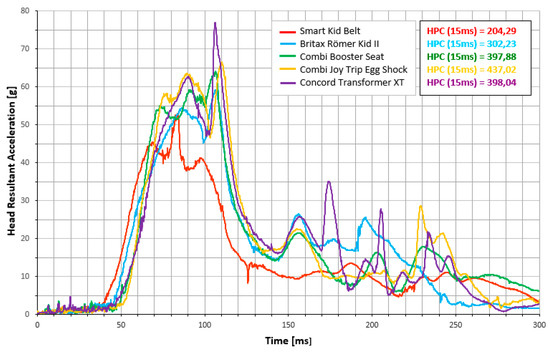 The first chart (Figure 2) shows Chest Resultant Acceleration which aims to determine how the acceleration changes with time. It allows to compare how a particular device works—delay of initiation of action—that is why each peak is displaced from the other. There are two accumulations of peaks; the first one is considered because of the impact that occurs—rapid deceleration of the test bench. They are the highest peaks that give information about accelerations in the child’s body.