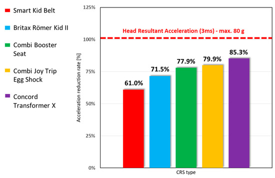 Chest Resultant Acceleration for all CRS tested regarding the maximum limit according to Reg. No. 129. The best result was Britax Romer Kid II—37.6% beneath the limit. The worst one among the other CRS was the Combi Joy Trip Egg Shock.