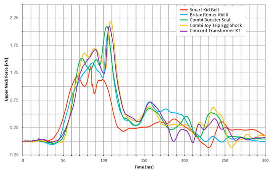 Upper neck force for all the devices tested. The graph shows how the upper neck force changes with time—the first, highest peaks provide information about maximum neck force during rapid deceleration of the test bench.