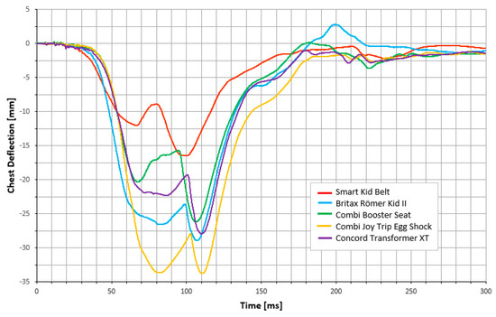 Chest deflection for all tested devices. The graph shows how the chest deflection changes with time—the highest peaks provide information about maximum chest deflection during rapid deceleration of the test bench.
