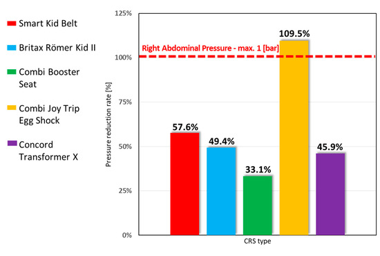 The recorded values of right abdominal pressure for individual restraint systems are: