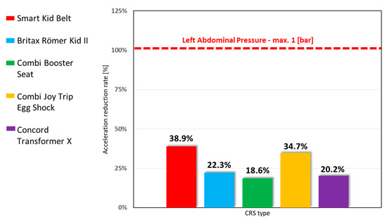 Analyzing the test results, it can be seen that the safety criteria pointed in No. 129 UN/ECE regulation was met for almost all the restraint devices tested (except for abdominal pressure in one of the tested solutions—9.5% over the limit ). However, the analysis of recorded data and individual values of physical quantities showed significant differences between each solution. As an example of where the parameters significantly differ is the Right Abdominal Pressure, in which the differences range between each CRS are 7% (Concord Transformer X – Britax Romer Kid II) even to 70% (Combi Booster Seat – Combi Joy Trip Egg Shock). The number of dynamic loads is influenced by the number of each device design solutions. The different parameter values for each device might be connected with the different initial positions of the dummy, the stiffness characteristics of the element on which the child is placed, and the solution of the seat belt guidance configuration characteristics. The research results clearly show that the issue of the safety of children’s transportation in vehicles requires further research and development to determine the correlation between design features of the restraint system and the registered physical parameters. The conclusion is that sthere is no one perfectly restraining device because of its design—each CRS is built differently, which causes different protection ranges of the sensitive point on the child’s body determined, for example, Smart Kid Belt is marked by the highest results in safety parameters, with HPC—25.5% and Head Resultant Acceleration—61%, but it does not provide as good protection as the other CRSs for the right and left abdominal—57.6% and 38.9% (the worst one of all others). The best protection of the abdominal is provided by Combi Booster Seat—18.6% (left side) which is 81.4% beneath the limit and 33.1% (right side).