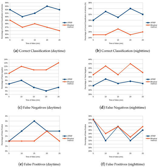 Figure 5c depicts the percentage of false negatives, i.e., the percentage of cases where the methods failed to correctly identify the vehicles. It can be observed in the graphs that the proposed method obtained a smaller number of false negatives in comparison to the Bhaskar method. This happens because the Bhaskar method was sometimes unable to identify the vehicles that were close to each other. This means that when a car is behind or very close to another one it is not correctly identified because of the image segmentation. Therefore, the ATRIP architecture reduced the number of false negatives compared to the Bhaskar method by approximately 11%.