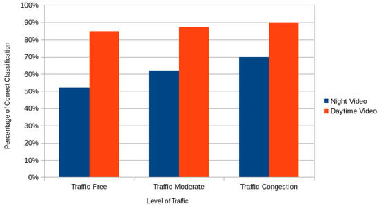 Figure 6 shows the percentage of correct classifications of the traffic flow on the highway. The correct classifications mean that the proposed architecture output was the same as the human specialist opinion. The results demonstrated that ATRIP provides an accurate classification of the levels of traffic congestion. This is especially true in the case of pinpointing traffic congestion in the daylight environments, where it reached about a 90% accuracy level. On the other hand, the classification accuracy is lower in low light environments. However, this situation was expected as it is rather difficult to correctly detect the vehicles in these situations.
